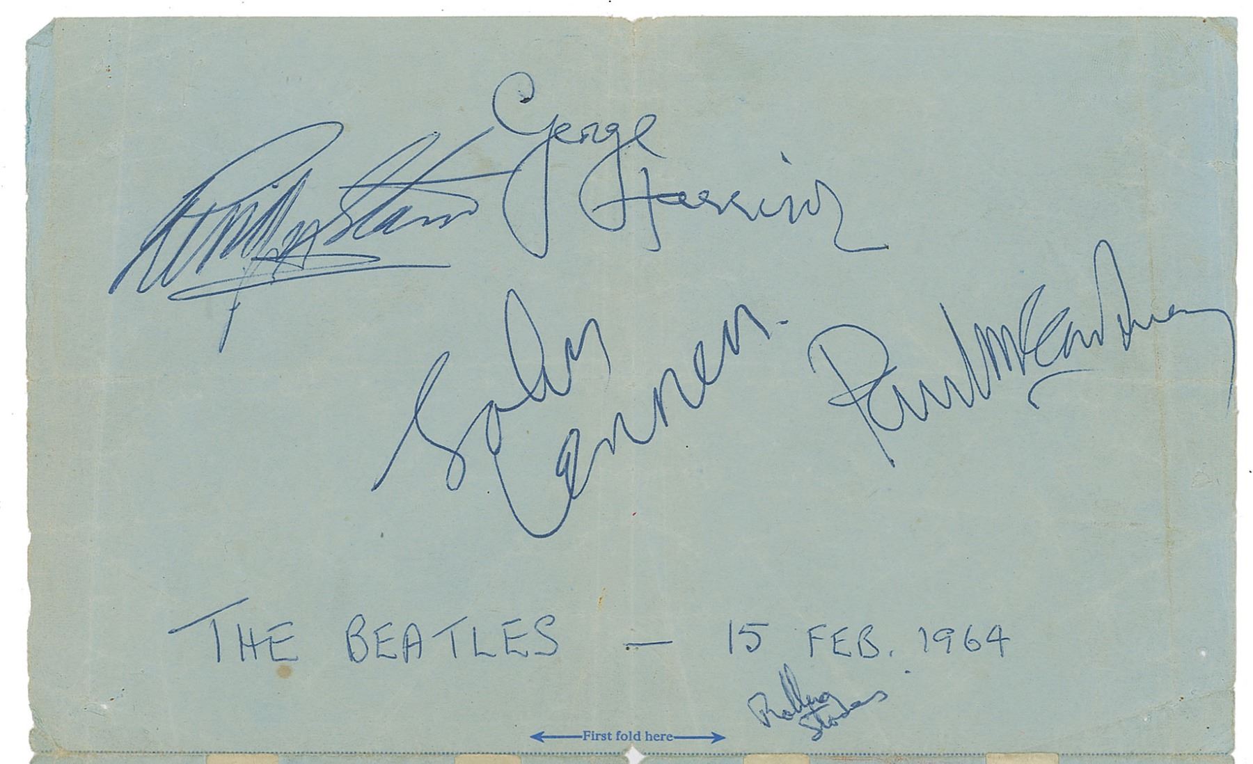 Coveted set of large vintage ballpoint signatures, "John Lennon," "Paul McCartney," "George Harrison," and "Ringo Starr," on a light blue 7.75 x 5 aerogramme, signed at the Deauville Hotel in Miami on February 15, 1964, their rehearsal day for their second appearance on the Ed Sullivan Show. The signatures were obtained by Marie Donaldson, a UK press officer for ABC Television, and sent to her nephew in New Zealand. Inside is a note from Donaldson, in part: "Here at last are the precious autographs I got from The Beatles! You will have read my letter all about the day I spent with them at the T.V. Studios. They are very nice & quite unspoilt by their success." In very good condition, with moderate overall creasing and handling wear, and a few unobtrusive corner staple holes. Accompanied by a certificate of authenticity from Tracks and a letter of provenance from the recipient's nephew. One week after making their famous appearance on the Ed Sullivan Show, broadcast from New York, the Beatles again joined Sullivan—this time at Miami’s Deauville Hotel—for a special live show. A spectacular signature set from a historic moment in Beatles history—their second introduction to the American public.