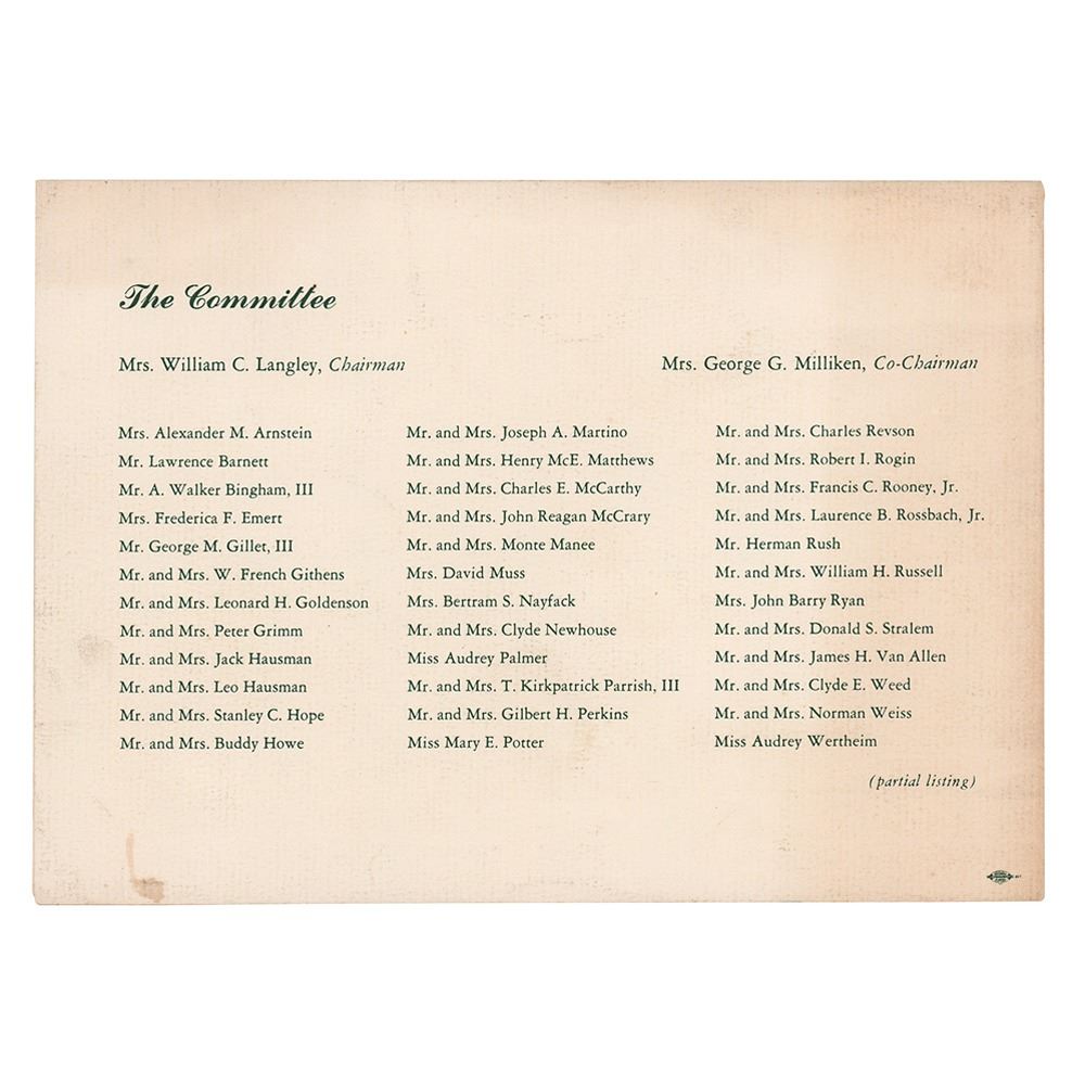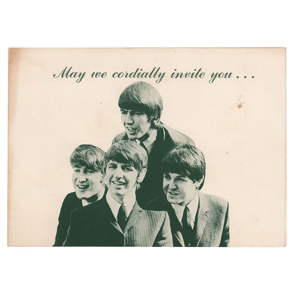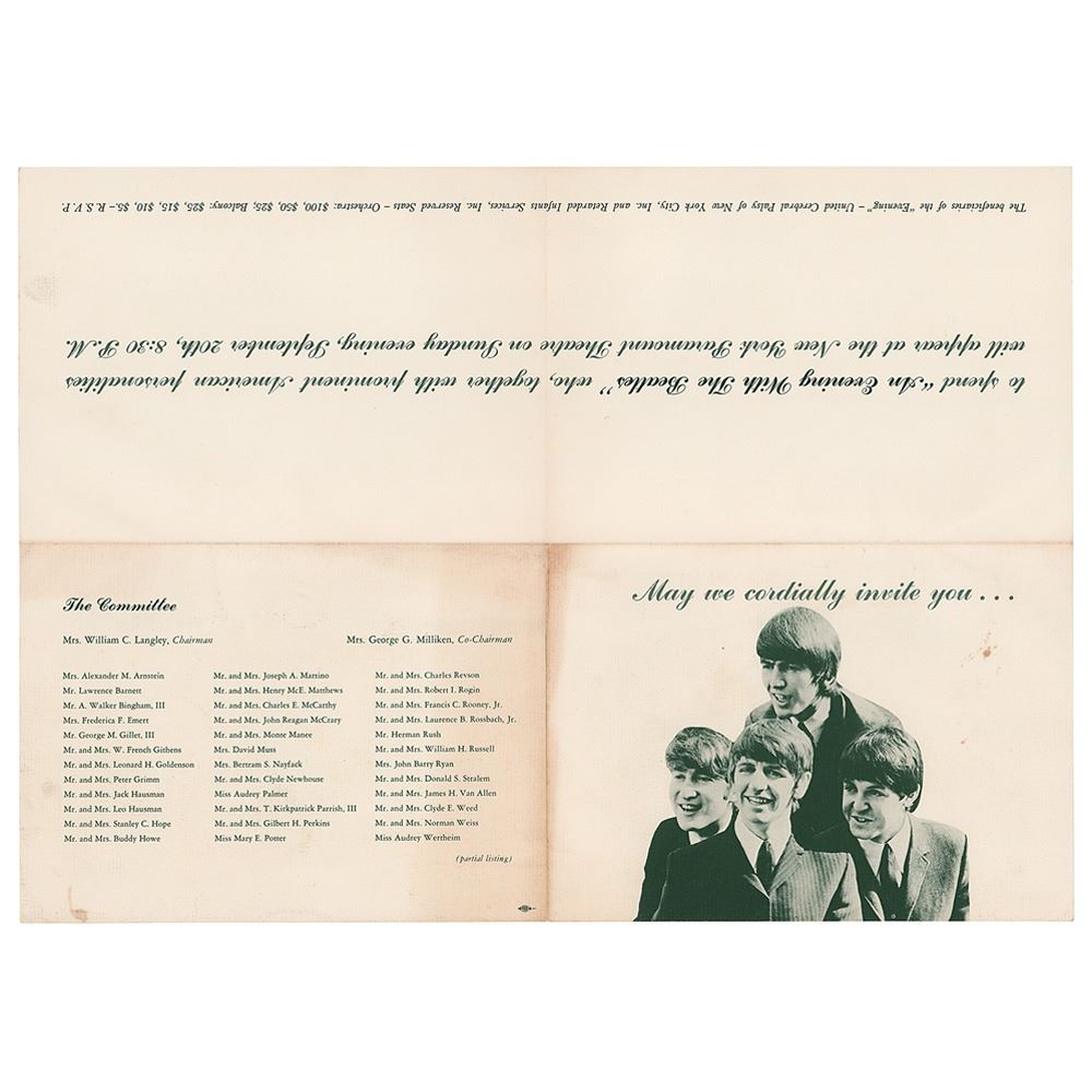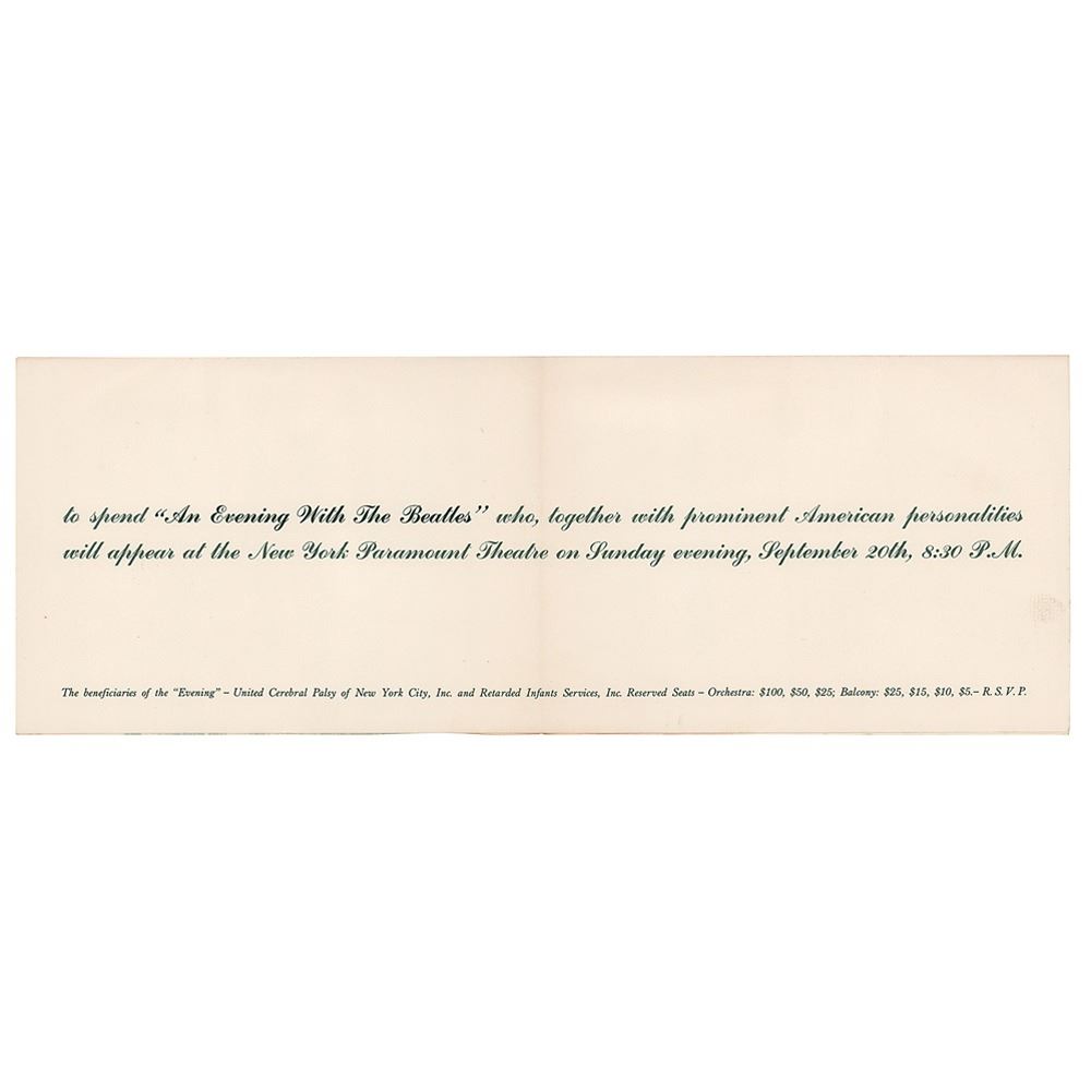 Extremely rare 7 x 5 gatefold invitation for “An Evening With The Beatles,” a performance that took place at the Paramount Theatre in New York City on September 20, 1964. The show was co-hosted by Ed Sullivan and the Beatles performed for no fee at this charity concert in aid of the United Cerebral Palsy of New York City and Retarded Infants Services. It was the last date of their first full US tour. The front features a great group portrait under cursive text, “May we cordially invite…,” the middle gatefold portion bears event information and ticket prices, and the back contains a partial listing of committee members. In fine condition, with some slightly irregular light toning. Accompanied by a certificate of authenticity from Tracks.