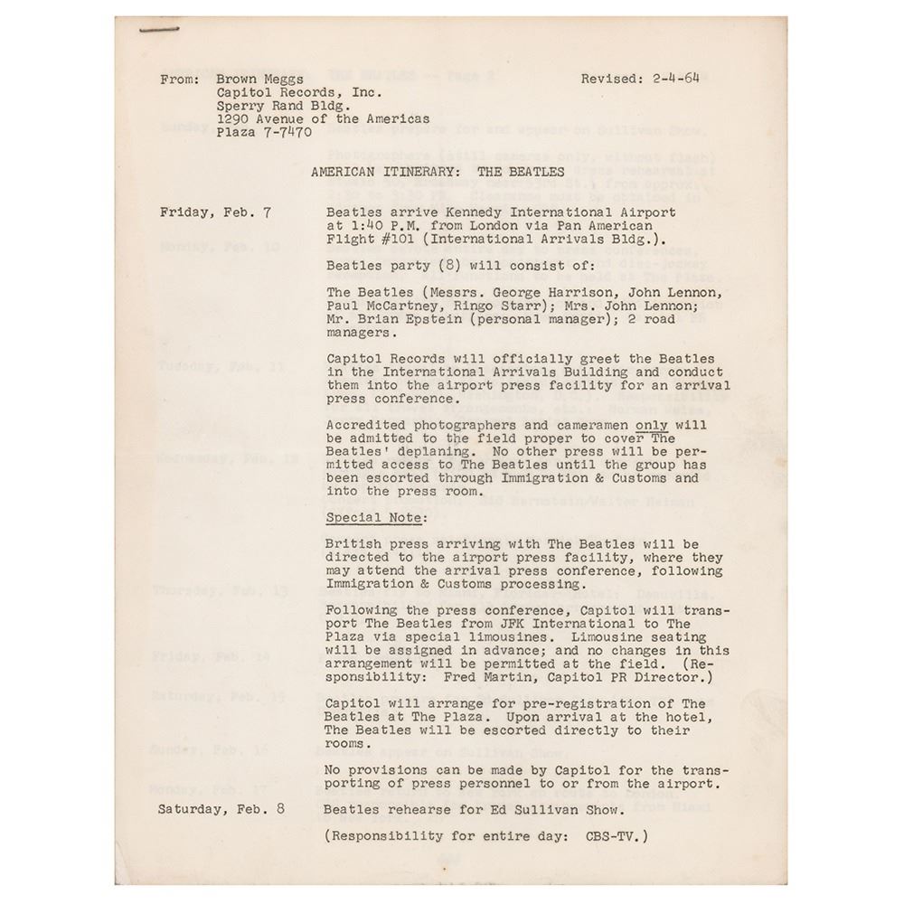 Internal Capitol Records itinerary for the Beatles' first United States tour, three pages, 8.5 x 11, February 4, 1964. The itinerary covers their historic appearance on the Ed Sullivan Show on February 9th, their first American concert at the Coliseum in Washington, D.C. on February 11th, two shows at Carnegie Hall on February 12th, and their second Sullivan appearance from the Deauville Hotel in Miami on February 16th. The last page lists contact information for pertinent personnel responsible for organizing these events. In fine condition.