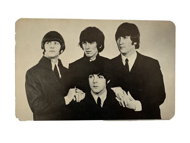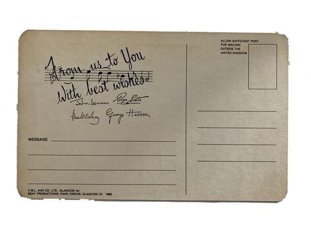 Very rare black and white photo of the Beatles on a postcard from England, 1966. Includes printed signatures of each member. Text on the back says "From us to You with best wishes" on musical notes. Postcard from Beat Productions, Park Circus, Glascow. (8"x5").