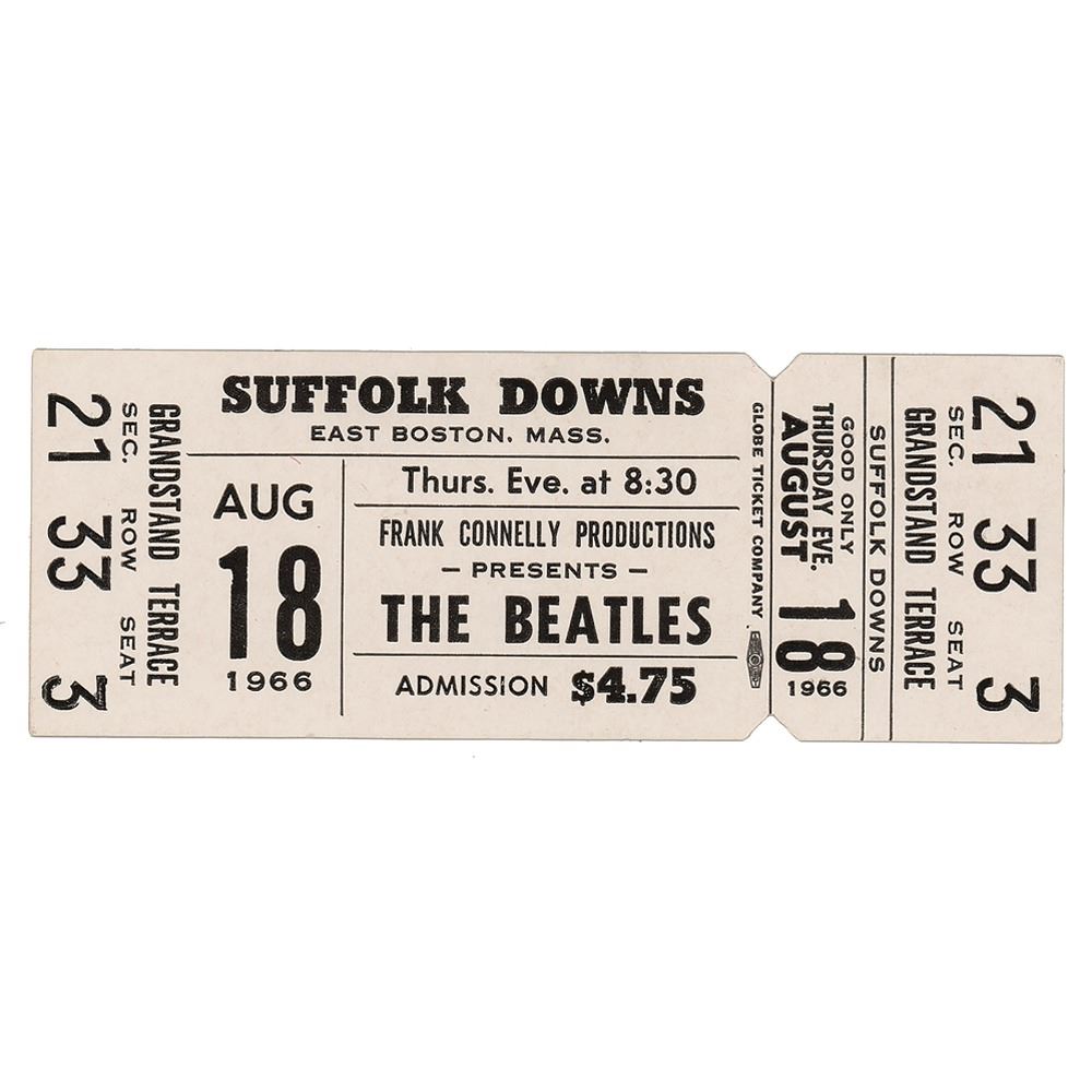 Unused 'white' ticket for the Beatles concert at Suffolk Downs in East Boston, Massachusetts, on August 18, 1966, for admission to the grandstand terrace. The ticket, measuring 4 x 1.5, is for "Sec. 21," "Row 33," and "Seat 3." In very fine condition. These tickets were released in seven different colors.