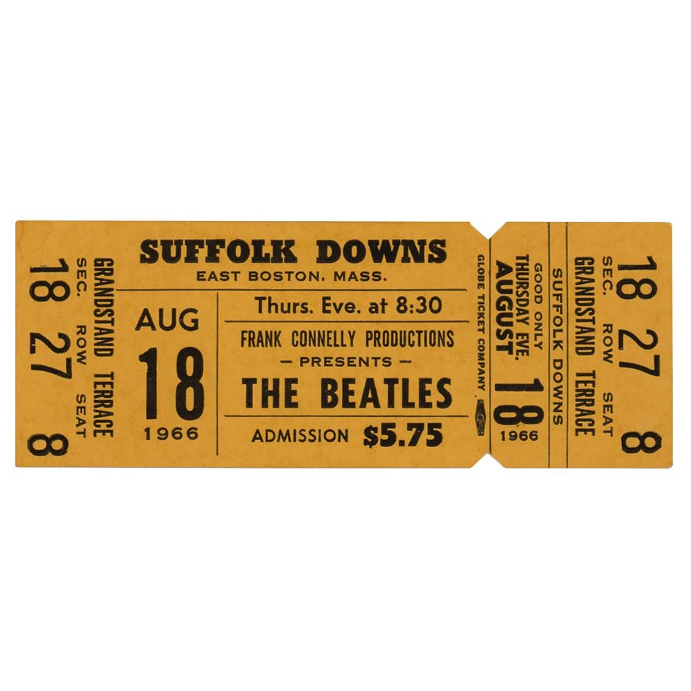 Unused 'yellow' ticket for the Beatles concert at Suffolk Downs in East Boston, Massachusetts, on August 18, 1966, for admission to the grandstand terrace. The ticket, measuring 4 x 1.5, is for "Sec. 18," "Row 27," and "Seat 8." In fine condition. These tickets were released in seven different colors.