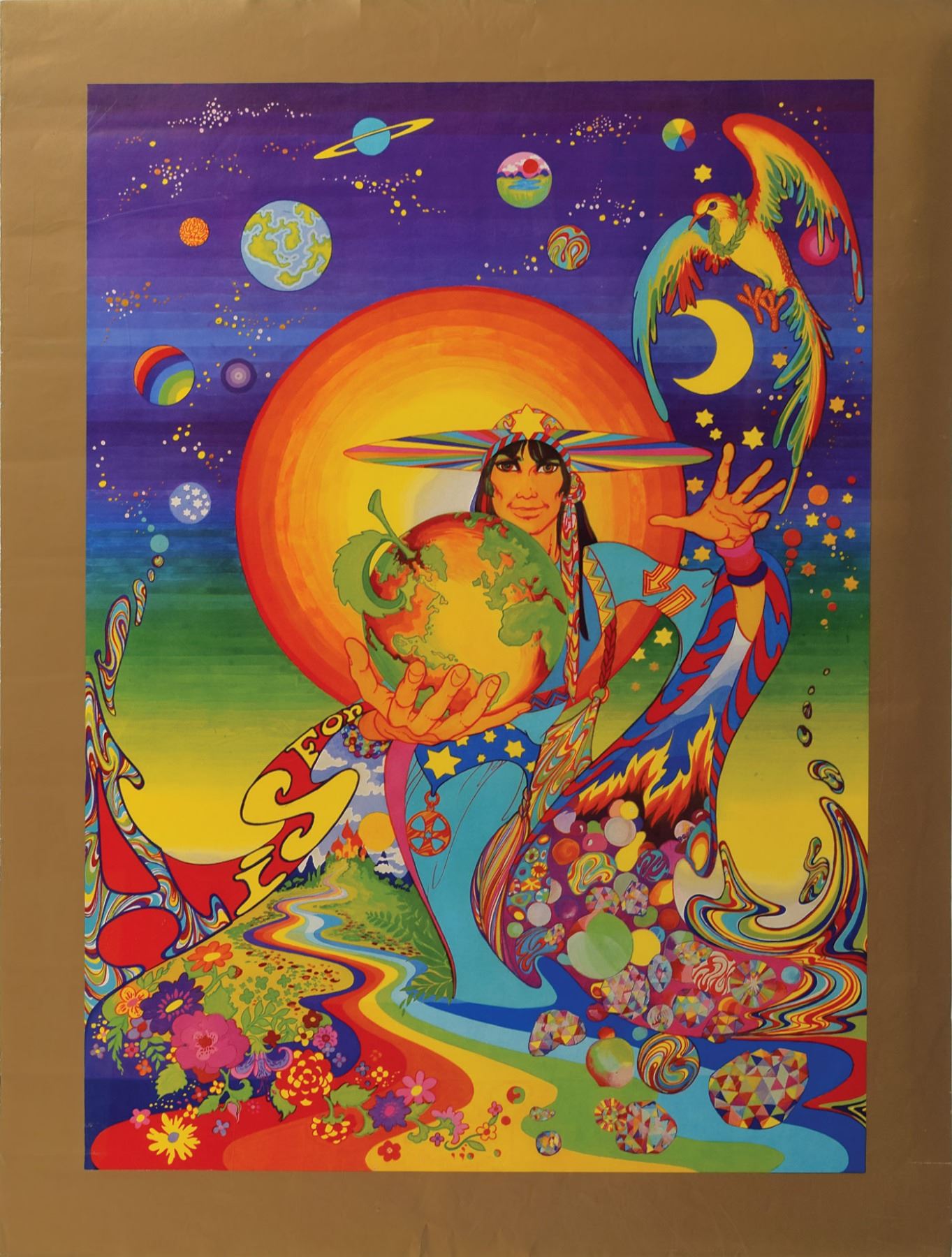 Vintage color 22 x 29.25 Apple Publishing poster from the short-lived Apple Boutique, designed by the art collective The Fool, and featuring psychedelic imagery with galactic goddess holding the Earth with stem and leaf, and text to the left reading: “A is for [Apple].” Reverse bears ‘The Fool’ and Apple Publishing and Company copyright stamp. Rolled and in fine condition, with light horizontal creases. Accompanied by a certificate of authenticity from Tracks. Consisting of Simon Posthuma, Marijke Koger, Barry Finch, and Josje Leeger, The Fool was a Dutch collective of designers, painters, and musicians that, in 1967, was given the task of designing and stocking the Apple Boutique, a shop on Baker Street in central London set up by the Beatles. The Apple Boutique was open for less than a year, from 1967 to 1968. A rare and sought-after Apple poster.