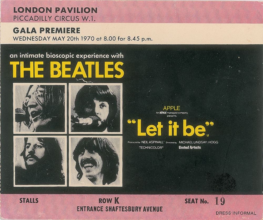 Original 5.5 x 4.5 ticket stub for the premiere of the Beatles film Let It Be, which took place at the London Pavilion on May 20, 1970. The ticket is issued as “Stalls, Row K, Seat No. 19.” In very good to fine condition, with two light creases. Although none of the Beatles attended the premier, guests included Cynthia Lennon, Jane Asher, Richard Lester, Mary Hopkin, Spike Milligan, Lulu, members of the Rolling Stones, Fleetwood Mac, and the head of EMI Records, Sir Joseph Lockwood. Included with the ticket is a letter from the London Evening News, dated May 14, 1970, which congratulates the reader on “being one of the 100 winners in the Beatles Contest,” and forwards them "tickets for the Premiere." Additionally, around 50 followers of Hare Krishna, who had close connections with George Harrison, also attended the premiere, and included is a Hare Krishna flyer. Accompanied by a certificate of authenticity from Tracks.
