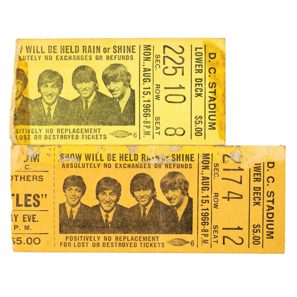 Two ticket stubs for the Beatles concert at D. C. Stadium in Washington on August 15, 1966, for admission to the lower deck. In very good to fine condition.