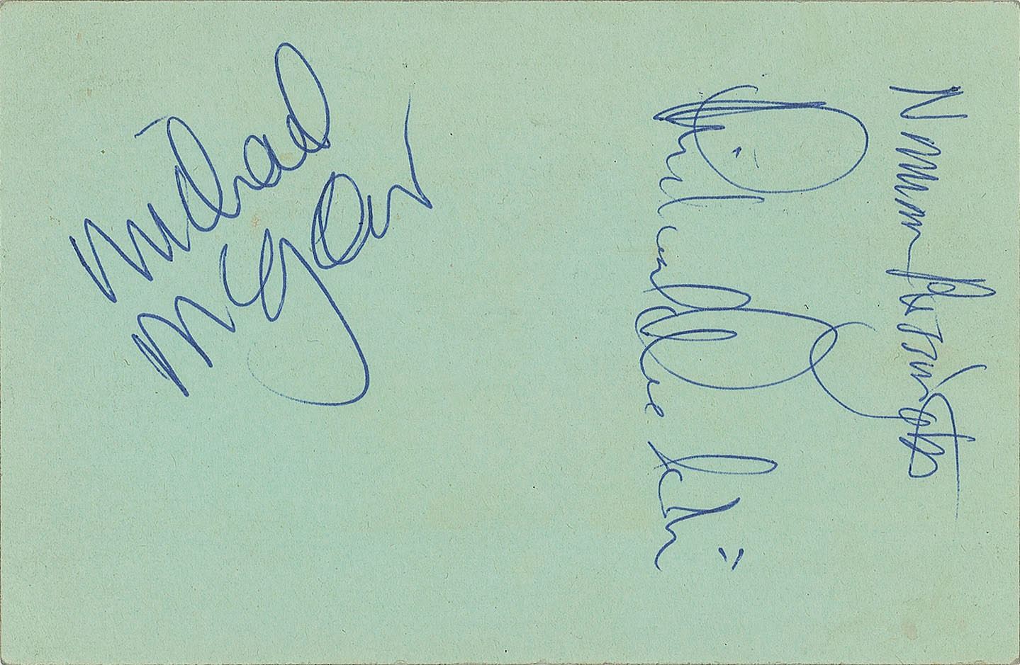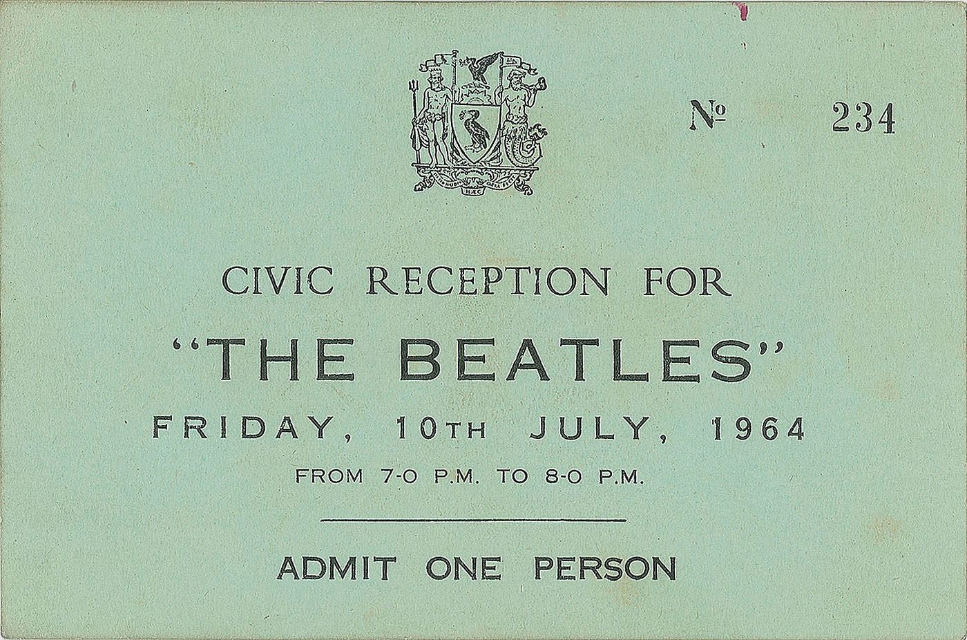 Original 5.25 x 3.5 ticket for the "Civic Reception for 'The Beatles'" held at Liverpool's town hall on July 10, 1964, signed on the reverse in blue ballpoint by Paul McCartney's brother Mike McGear, Norman Rossington, and one other. The ticket is marked "No. 234." In fine condition. The Beatles were in Liverpool for the premiere of their first feature film, A Hard Day's Night. Accompanied by a certificate of authenticity from Tracks.