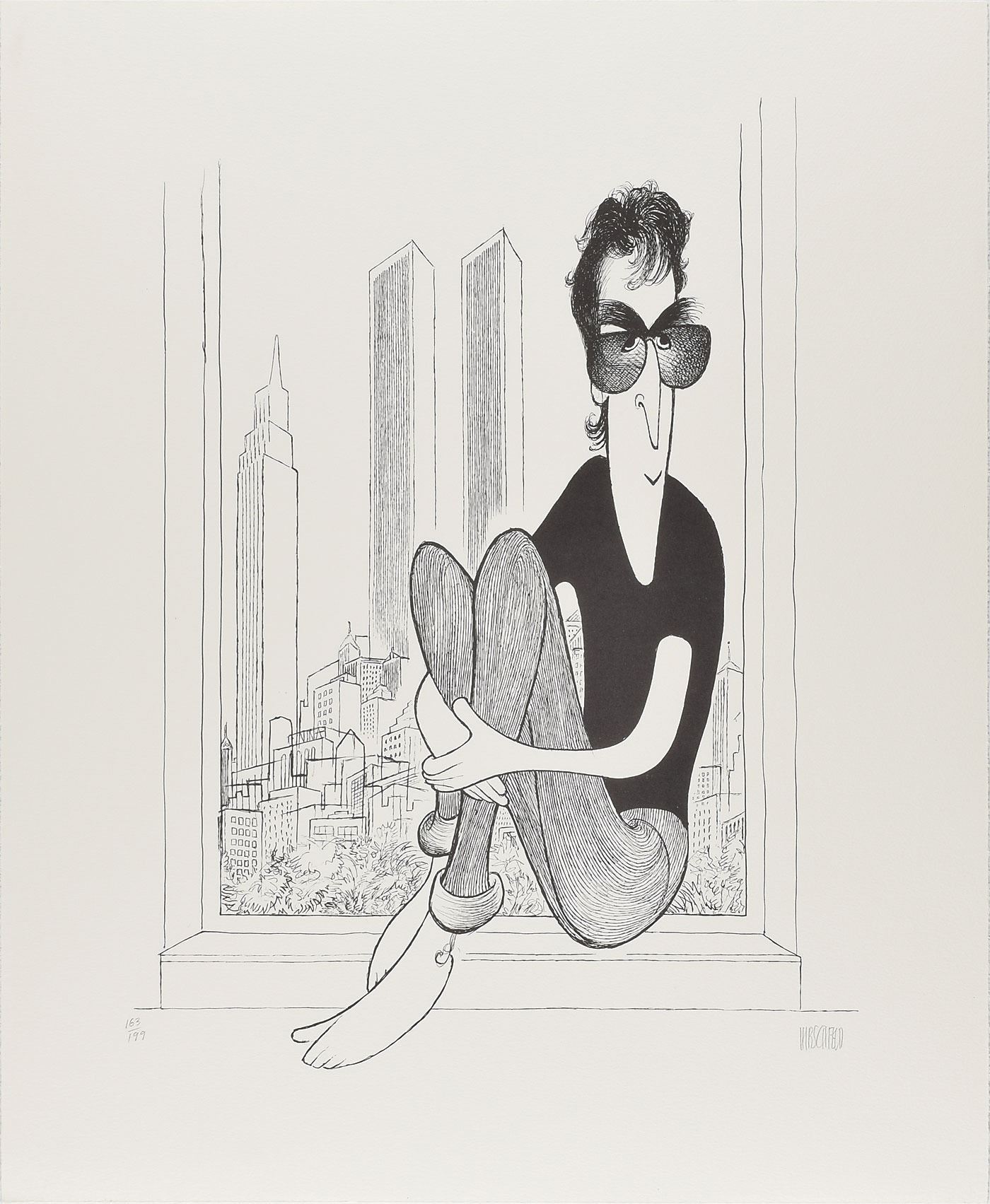 Limited edition 18 x 22 lithograph entitled 'Lennon at Home,' numbered 163/199, signed in the lower right in pencil by artist Al Hirschfeld, "Hirschfeld." Drawn in 1997 and featured on page 335 of Hirschfeld's book On Line, this print took on a new meaning in 2001: it shows the slain Beatle John Lennon sitting in the window of his New York apartment, with the World Trade Center's Twin Towers standing in the background—the three sadly lost to fanaticism. Of this piece, Hirschfeld commented: 'The ex-Beatle is sitting in his windowsill at the Dakota on Central Park West, where he lived and where he was gunned down in 1980. His shape here is not that different from the skyscrapers in the skyline behind him, super-vertical. This drawing gets across the playful, mischievous, professorial quality he had.' In very fine condition.