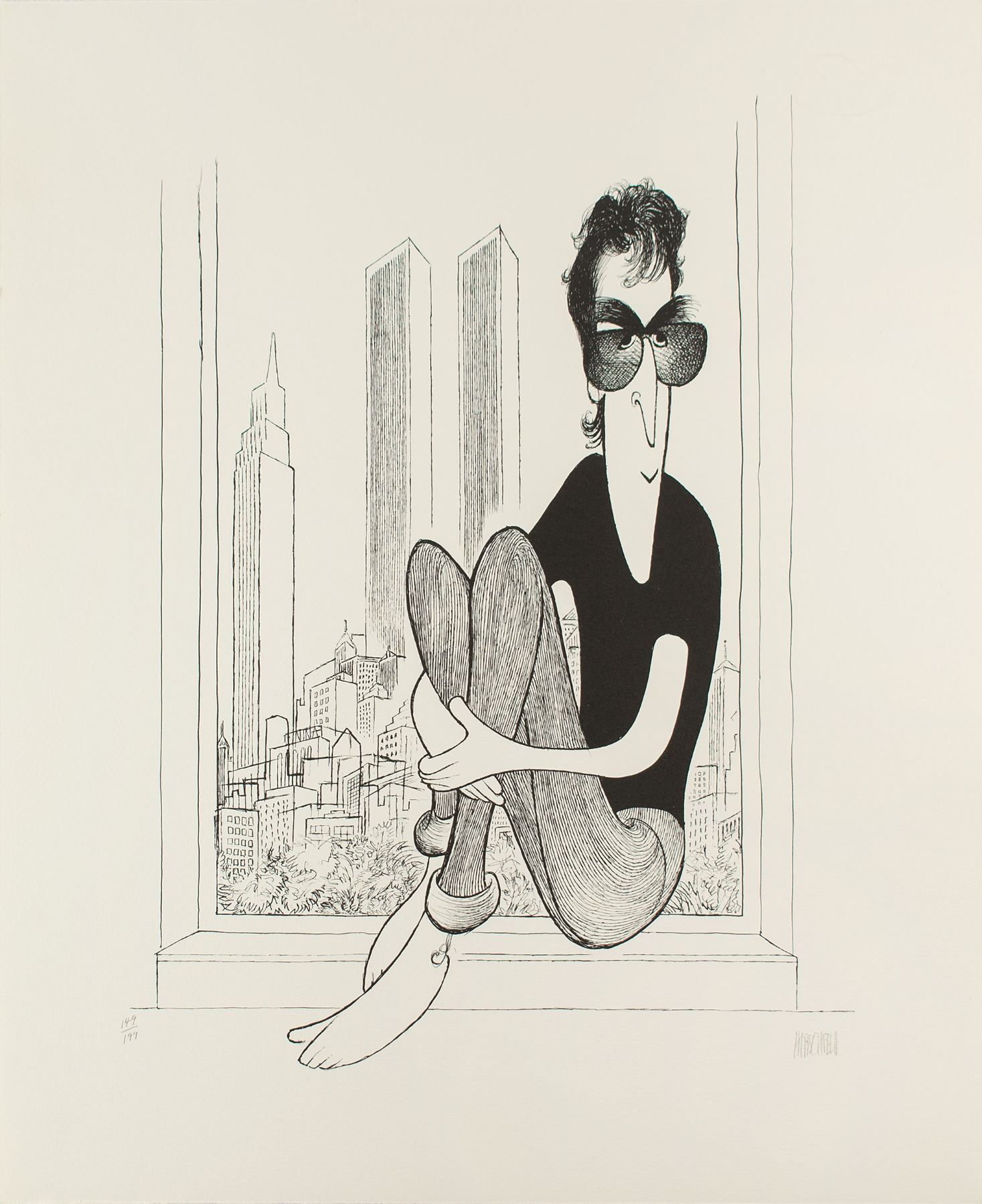 Limited edition 18 x 22 lithograph entitled 'Lennon at Home,' numbered 149/199, signed in the lower right in pencil by artist Al Hirschfeld, "Hirschfeld." Drawn in 1997 and featured on page 335 of Hirschfeld's book On Line, this print took on a new meaning in 2001: it shows the slain Beatle John Lennon sitting in the window of his New York apartment, with the World Trade Center's Twin Towers standing in the background—the three sadly lost to fanaticism. Of this piece, Hirschfeld commented: 'The ex-Beatle is sitting in his windowsill at the Dakota on Central Park West, where he lived and where he was gunned down in 1980. His shape here is not that different from the skyscrapers in the skyline behind him, super-vertical. This drawing gets across the playful, mischievous, professorial quality he had.' In fine condition.