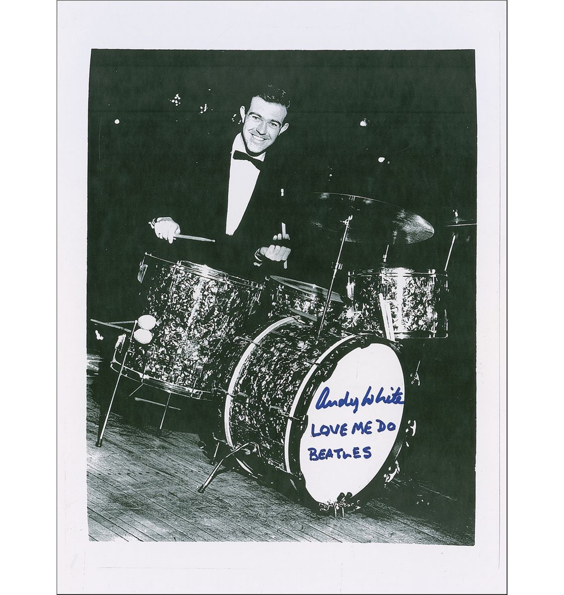 Nostalgic 8.5 x 11 cardstock photo of White at his drum set, signed in blue felt tip, “Andy White, Love Me Do, The Beatles.” In fine condition.