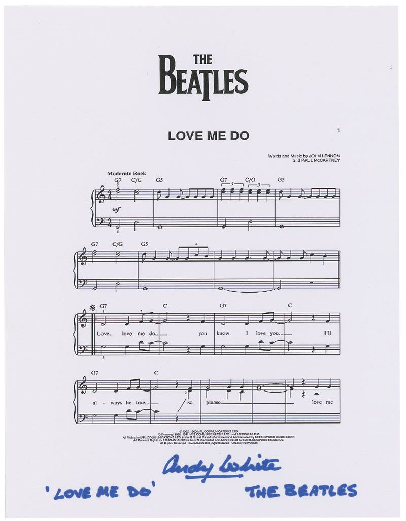 Sheet music for ‘Love Me Do,’ one page, 8.5 x 11, signed at the conclusion in blue felt tip, “Andy White, ‘Love Me Do,’ The Beatles.” In fine condition, with a bit of haloing and spreading to the signature.