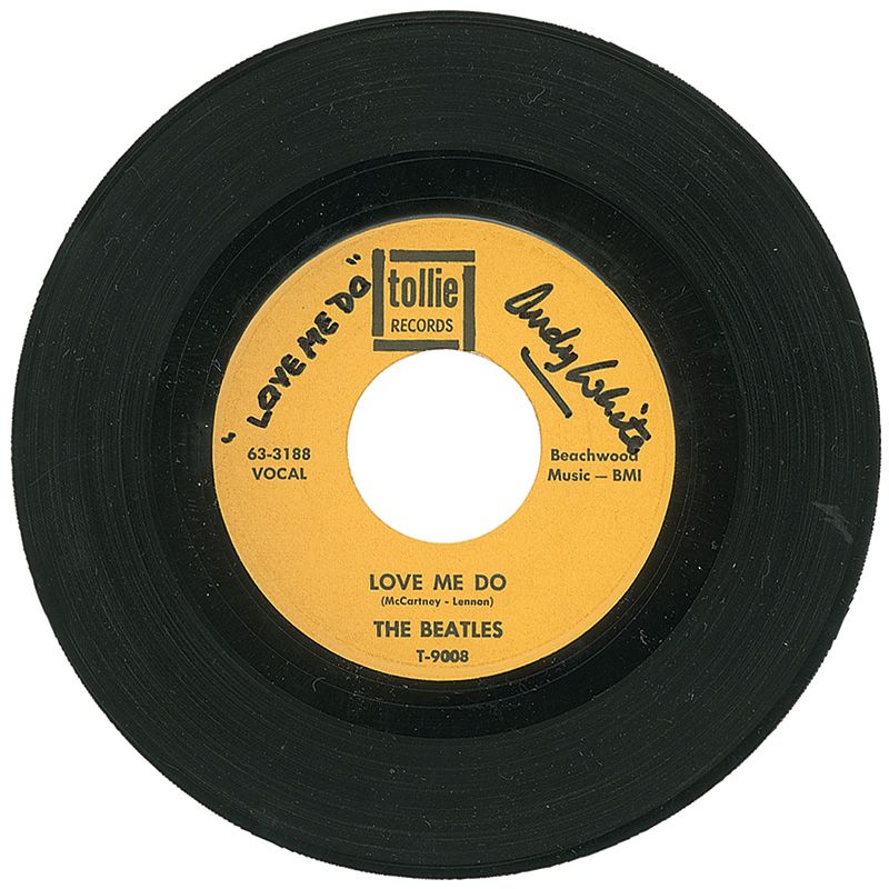Tollie Records pressing 45 rpm record of ‘Love Me Do,’ signed on the label in black felt tip, “Love Me Do,’ Andy White.” In fine condition.
