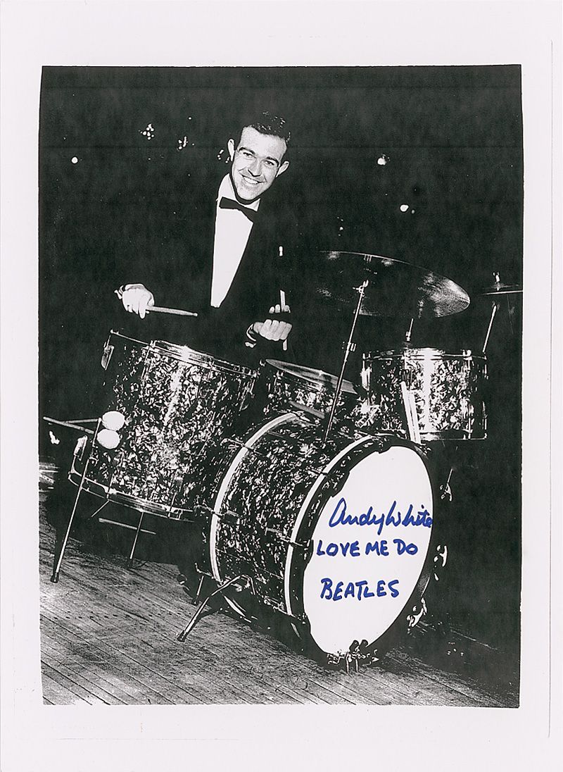 Nostalgic 8.5 x 11 cardstock photo of White at his drum set, signed in blue felt tip, “Andy White, Love Me Do, The Beatles.” In fine condition, with some faint crop lines to edges.