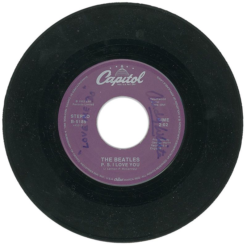 Capitol Records pressing 45 rpm record of ‘Love Me Do/P.S. I Love You’ signed on the label in blue felt tip, “’Love Me Do,’ Andy White.” In fine condition, with moderate contrast to the signature.