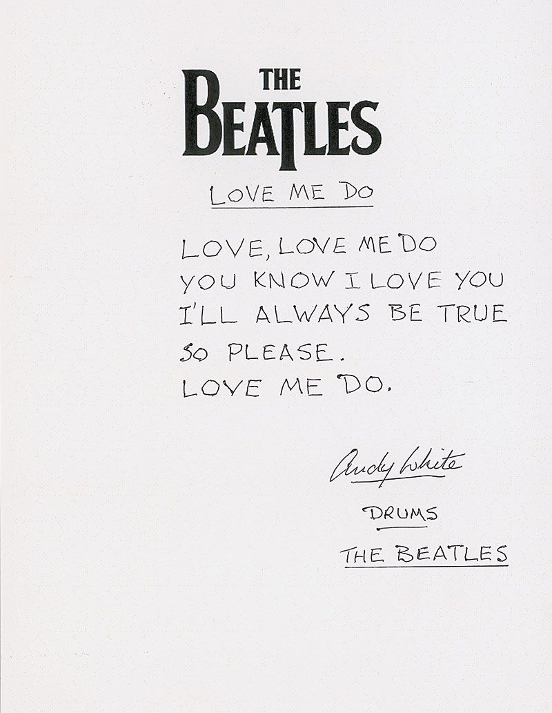 Drummer best known for replacing Ringo Starr on drums on The Beatles' first single, ‘Love Me Do.’ Souvenir handwritten lyrics to the first verse of ‘Love Me Do,’ on an off-white 8.5 x 11 sheet of Beatles letterhead, signed at the conclusion, “Andy White, Drums, The Beatles.” In very fine condition.