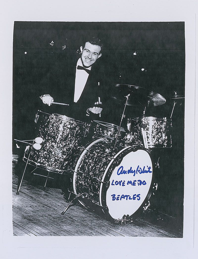 Cardstock 8.5 x 11 signed photo of White behind his drum set, signed in blue felt tip, “Andy White, Love Me Do, The Beatles.” In fine condition.