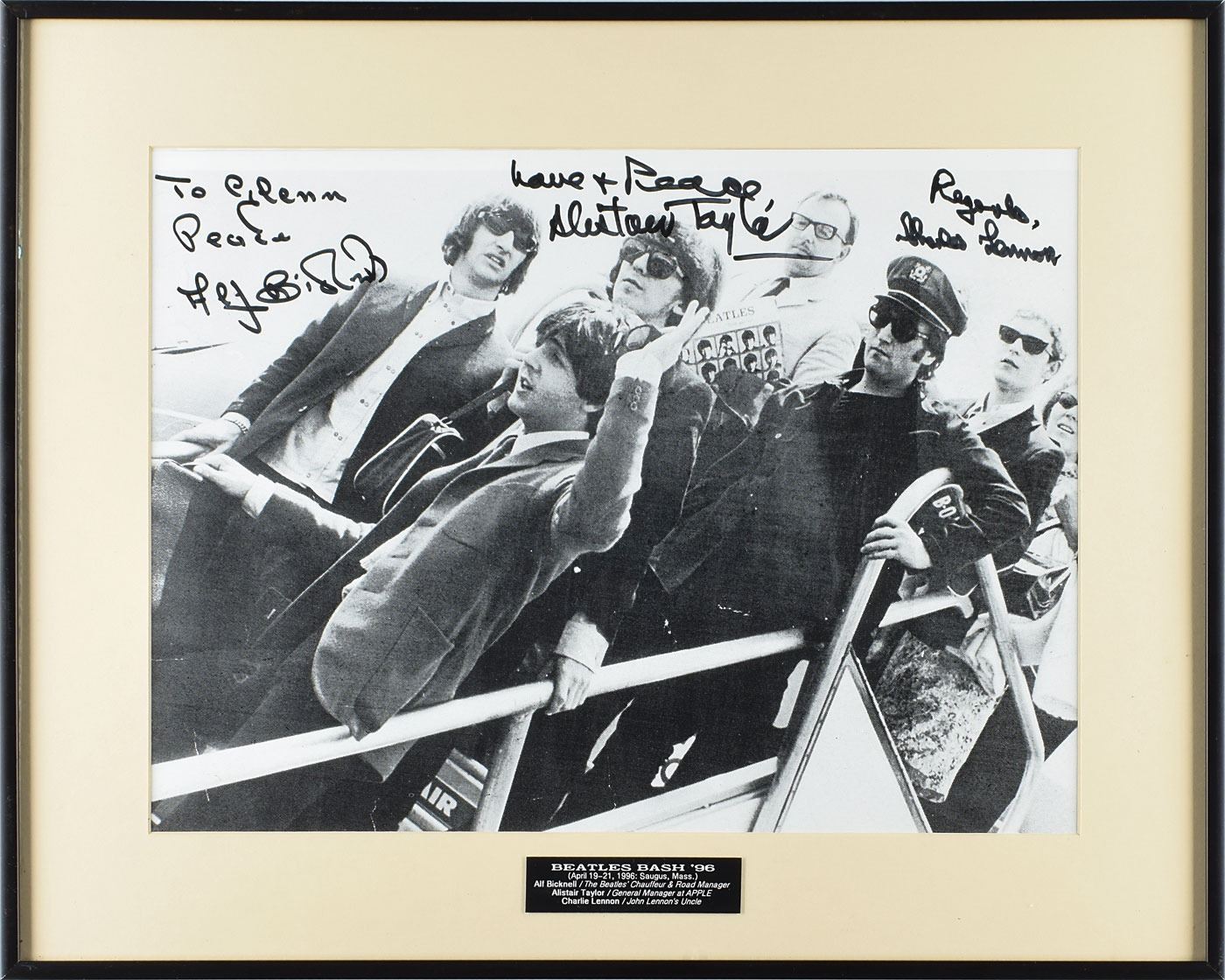 Glossy 15.5 x 11.5 photo of the Beatles walking down airstairs after a plane flight, signed and inscribed in black felt tip by three Beatles associates, "To Glenn, Peace, Alf Bicknell," "Love & Peace, Alistair Taylor," and "Regards, Charles Lennon.” Matted and framed with a nameplate indicating that the signatures were obtained at Beatles Bash '96 in Saugus Massachusetts, to an overall size of 20.5 x 16.25. In fine condition, with somewhat grainy image quality. Alf Bicknell (1928–2004) was the Beatles' road manager and chauffeur; James 'Alistair' Taylor (1935–2004) was an Apple Records general manager and personal assistant to Brian Epstein; and Charlie Lennon (1919–2002) was the favorite uncle of John Lennon.