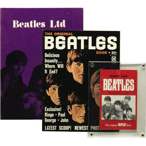 <B>Beatles Assortment - Group of 3.</B></I> Here is a batch of three collectible items of the "Fab Four." Included in this lot are the Original Beatles Book (1964), Beatles Ltd (1964), and an unused "hang-tag" for the original Beatles Shirt. The "hang-tag's" are tough to find as they had a punch out card of the Liverpudlians on it. Don't wait, say "Yeah, Yeah, Yeah" to placing a bid!
