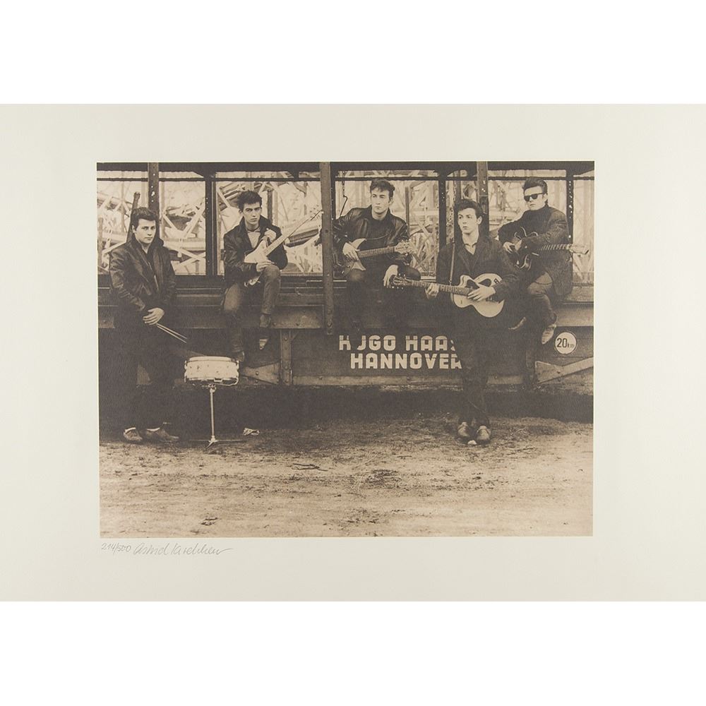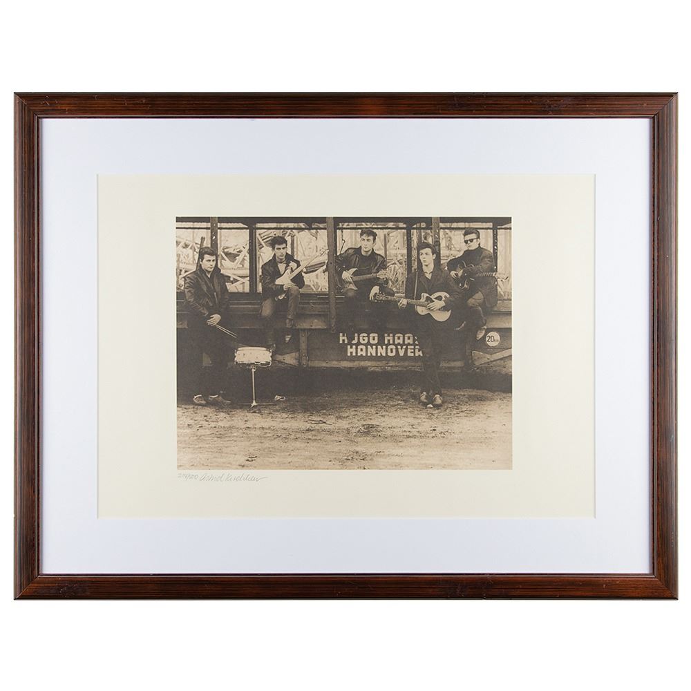Limited edition sepia-tone 23 x 16 signed print of a photograph showing the Beatles on the grounds of the Hamburg Fun Fair in Hamburg, Germany. While it seems the Beatles are the most-photographed entertainers of all time, Astrid Kirchherr is perhaps the photographer most associated with the group. The original November 1960 photograph was taken as part of the band's first official photo session and has become the most iconic image of their time in Hamburg before achieving worldwide fame. Kirchherr is credited with introducing the Beatles to their ‘mop top’ hairstyle, and Beatles historian Mark Lewishohn has described her influence on the band as 'immeasurable.' The print captures the original line-up of Pete Best, George Harrison, John Lennon, Paul McCartney, and Stuart Sutcliffe posing on a Hugo Haas train car and is numbered 214/500 and signed in the lower border in pencil by Kirchherr. Matted and framed to an overall size of 30.75 x 23.75. In very fine condition.