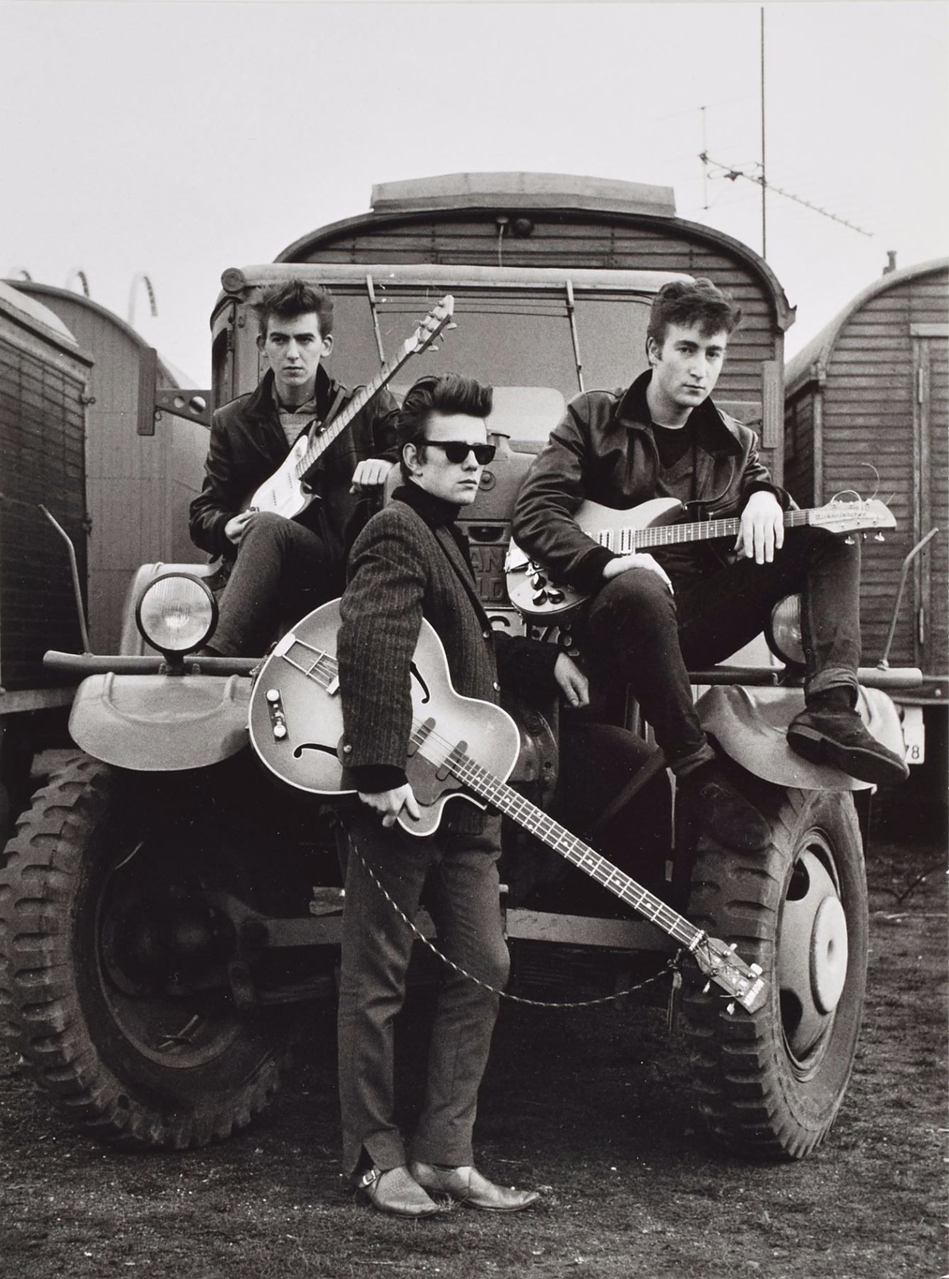 Superb 7 x 9.25 silver gelatin photo of Stuart Sutcliffe, George Harrison, and John Lennon posing on the front of a large truck, signed on the reverse in pencil by the photographer, "Astrid Kirchherr." This is a photo developed from the original negative of Astrid's archive. Includes the original black presentation folder, also signed on the front in gold ink by Kirchherr. In very fine condition.
