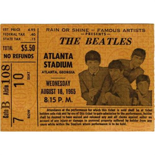 <B>Beatles Atlanta Stadium Concert Ticket Stub (1965).</B></I> Another used ticket from their stellar show at the Atlanta Stadium in August 1965, this one a slightly more rare salmon-colored ticket to the field-level seats. In Very Fine condition with very mild edge and corner wear.<BR><BR><b>Shipping:</b> Flat Material, Small (<a target="_blank" href="http://www.heritageauctions.com/common/shipping.php">view shipping information</a>)