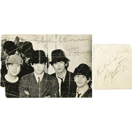 <B>Beatles Autographs Set (1964).</B></I> Includes a clipped b&w photo from an issue of <B>Beatles Monthly</B></I> (6" x 4.5") signed by John, Paul, and George in black ink, in Very Good condition with a little tearing, heavy creasing and some tape on the reverse; plus a portion of an envelope (2.5" x 3") inscribed and signed by Ringo Starr in pencil, in Fine to Very Fine condition with some mild to moderate tanning.<I>Accompanied by LOA from PSA/DNA.</B></I><BR><BR><b>Shipping:</b> Flat Material, Small (<a target="_blank" href="http://www.heritageauctions.com/common/shipping.php">view shipping information</a>) <BR><BR><B>Important n