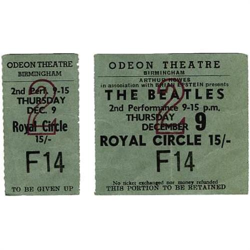 <B>Beatles Birmingham Concert Ticket.</B></I> A used ticket with separate, matching stub from the Boys' December 9, 1965, performance at the Odeon Theatre in Birmingham -- one of the last few nights of what would turn out to be their final British concert tour. In Excellent condition with a bisecting vertical fold crease and very faint discoloration on the main piece.<BR><BR><b>Shipping:</b> Flat Material, Small (<a target="_blank" href="http://www.heritageauctions.com/common/shipping.php">view shipping information</a>)