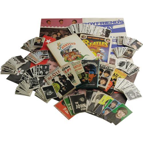 <B>Beatles Books, Posters, and Trading Cards Group.</B></I> This massive stack of Beatlemania features a 72" x 19" color banner poster (Very Fine condition with some light wear); a 54" x 17" banner poster in b&w with red spot color (in Very Fine condition with light wear and some staining on the back); the large hardbound volumes "The Beatles Illustrated Lyrics" volumes 1 and 2 (in Fine condition with some shelf wear and tanning to the spine); the paperbacks "The Beatle Book," "The Beatles in Help!," "The Beatles in A Hard Day's Night," "The beatles: The Authorized Biography," "The True Story of the Beatles," and "The Beatles Up to Date"; and approximately 500 Beatles trading cards (Excellent with very light waer). A great selection of items.