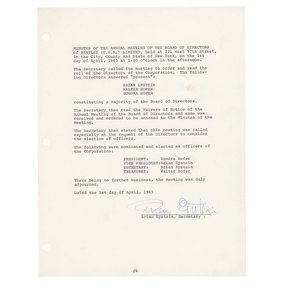 DS, one page, 8.5 x 11, April 1, 1965. A document regarding the "Minutes of the Annual Meeting of the Board of Directors of Beatles (U.S.A.) Limited," which concerns the election of company officers, with Sondra Hofer named as president, Brian Epstein as vice president and secretary, and Walter Hofer as treasurer. Signed crisply at the conclusion in blue ballpoint by Epstein. In fine condition.