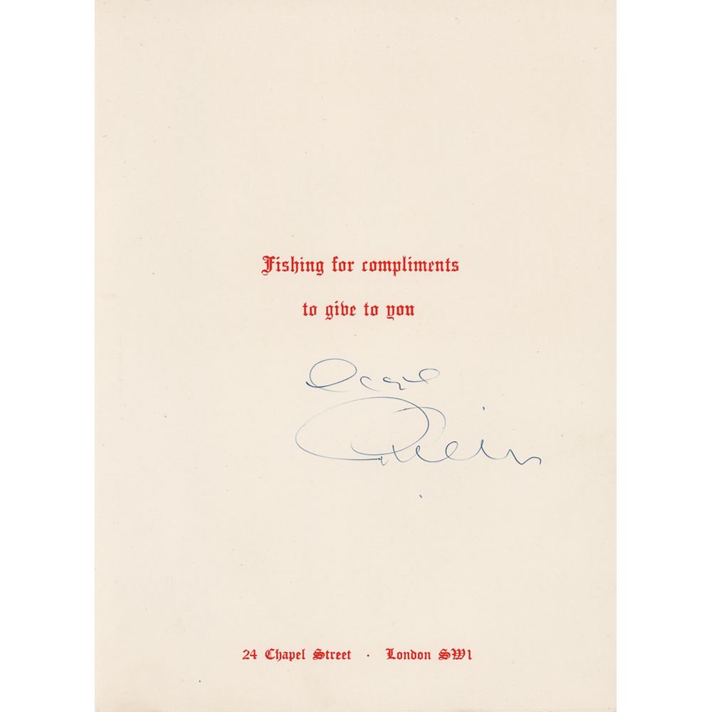 Scarce original ‘Fishing for compliments’ greeting card sent out by Brian Epstein, who is pictured on the front holding a fishing pole, measures 11.75 x 8 open, signed inside in blue ballpoint, “Love, Brian.” The interior contains Epstein’s home address “24 Chapel Street, London, SW1” printed at the bottom. In very fine condition. Accompanied by a certificate of authenticity from Tracks.