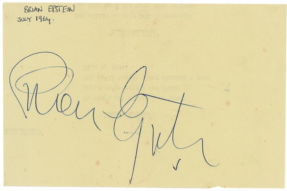 Famed Beatles discoverer and manager. Vintage ballpoint signature, “Brian Epstein,” on a light yellow 7 x 4.5 sheet, with a collector’s notation at top left reading, “Brian Epstein July 1964.” A vertical fold through a single letter of signature, some light creases and wrinkles, and a bit of light soiling and foxing, otherwise fine condition. Accompanied by a letter of provenance from the signature’s original recipient, stating, in part: “As we were leaving the venue [BBC Television Centre], we bumped into the celebrities who had just taken part in the recording of ‘Juke Box Jury.’ We recognised [sic] Brian Epstein immediately–this was during the height of Beatlemania–and we asked for his autograph on the only piece of paper we had.”