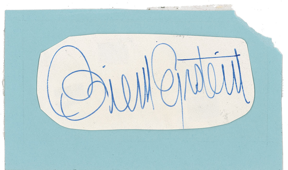 Famed Beatles discoverer and manager. Scarce vintage ink signature, “Brian Epstein,” on an off-white 3.5 x 1.5 irregularly clipped slip affixed to a 4.75 x 2.75 light blue slip. In fine condition, with a few light wrinkles. An uncommon signature of the music entrepreneur considered by some to be the ‘fifth Beatle.’