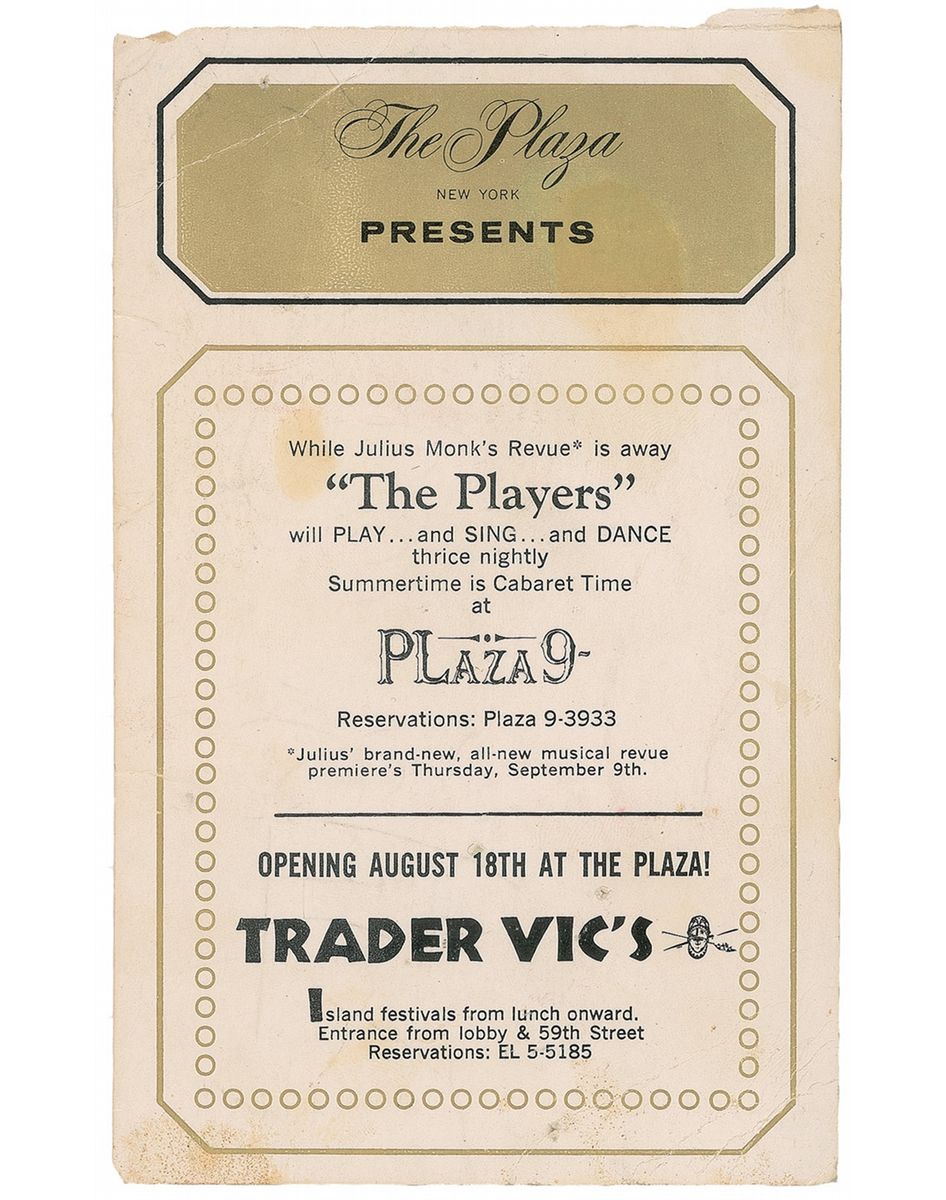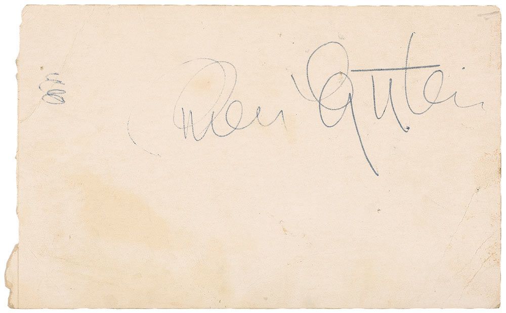 Famed Beatles discoverer and manager. Restaurant table card from the Plaza Hotel in New York, 6 x 3.75, signed on the reverse in black ballpoint by Epstein. Signature was obtained at the Plaza on August 14, 1965, at a performance by Cilla Black at the Persian Room, just one day before The Beatles record breaking concert at Shea Stadium. In very good condition, with beginning of signature light due to irregular ink flow, a few stray ink marks, and scattered creasing and soiling. Accompanied by a letter of provenance from the original recipient recounting the meeting with Epstein. In part: “A small group of friends and I decided to see Cilla Black at the Persian Room of the Plaza…A few minutes later the table next to us…filled up with a group of men. I recognized at least one person as a member of Sounds Incorporated, an opening act to the Beatles, and motioned to my friends…I was sitting a few feet away from Brian Epstein…I…finally got up the nerve to ask him for his autograph. Not having any paper, I grabbed a place card from our table and push it toward him with a pen that didn’t fully work that well. He said nothing, but signed the card (after trying to make the pen work).” Accompanied by a certificate of authenticity from Tracks.