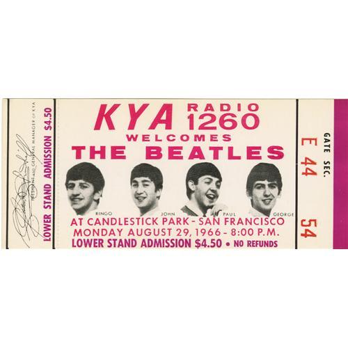 <B>Beatles Candlestick Park Concert Ticket.</B></I> An unused ticket for the Beatles' final live concert performance, held on August 29, 1966, at Candlestick Park in San Francisco. This ticket is for the lower stand admission and is in Excellent condition with mild soiling on the back.<BR><BR><b>Shipping:</b> Small Flat (<a target="_blank" href="http://www.heritageauctions.com/common/shipping.php">view shipping information</a>)