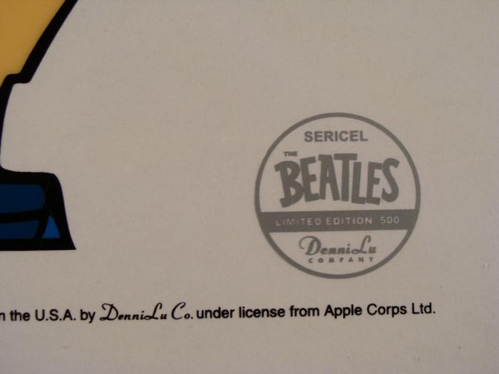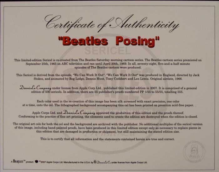 Title: "Beatles Posing"Medium: Serigraph cel, with background sheetSize: 13 1/2 inches squareCondition: ExcellentEdition size: 500Beatles seal, lower rightCertificate of Authenticity from DenniLu Company includedCopyright 2007 by Apple CorpsHere's what the Certificate of Authenticity has to say:"Each color used in the re-creation of this image has been silk screened with exact precision, one color at a time, onto the cel. The printed background accompanying this cel has been printed on premium acid-free paper." This is a classic looking Beatles pose from the fab 1960's cartoon!