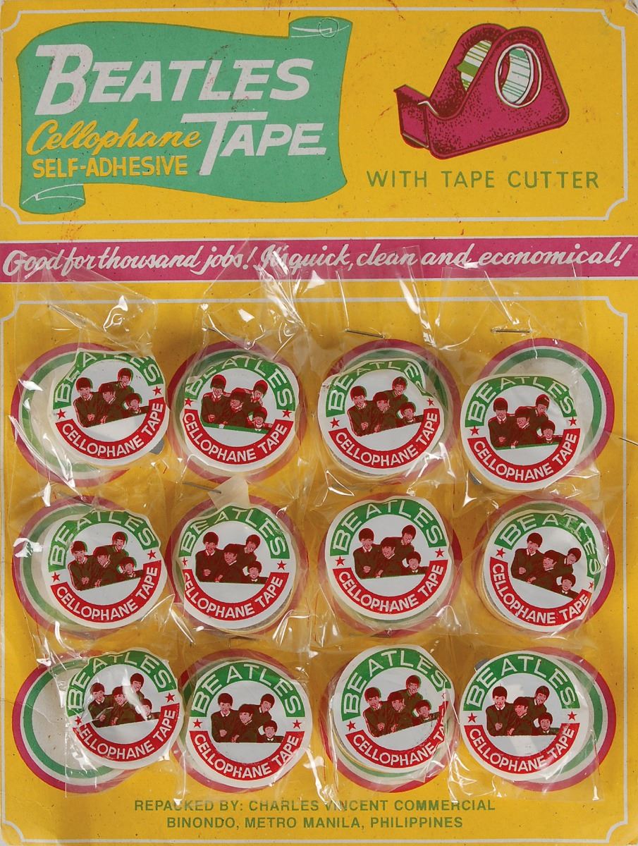 Rare 1966 Beatles cellophane self-adhesive tape display card manufactured in the Philippines, 7.75 x 10, retaining all twelve rolls of tape. In fine condition, with some staining to the board.