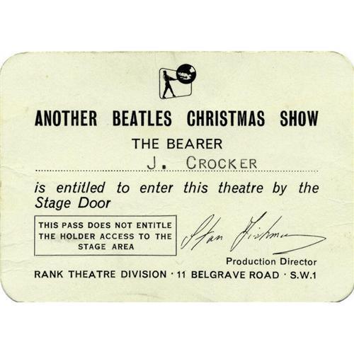 <B>Beatles Christmas Show Stage Pass.</B></I> Made out to one J. Crocker, this pass allowed the bearer entrance via the stage door during the Beatles' Christmas shows at the Hammersmith Odeon between December 24, 1964, and January 16, 1965. In great condition with a light amount of discoloration and minor wear to the edges.<BR><BR><b>Shipping:</b> Small Flat (<a target="_blank" href="http://www.heritageauctions.com/common/shipping.php">view shipping information</a>)