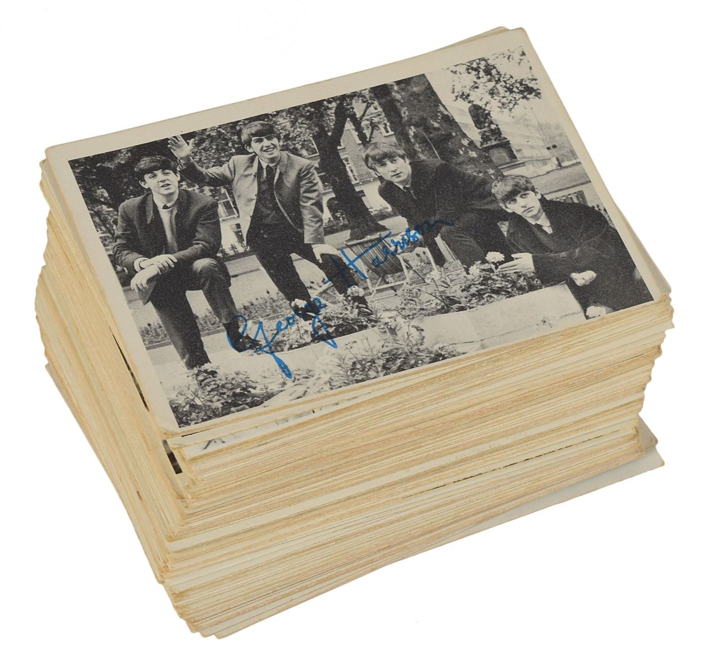 Group of vintage circa 1964 Beatles collectibles, including: a George Harrison bobblehead doll manufactured in Japan by Car Mascots, Inc., approximately 8? tall, featuring a gold base with facsimile signature, and a "Car Mascot" gold sticker on the bottom; a colorful 13? x 13? tray by Worcester Ware, showing John Lennon, Paul McCartney, George Harrison, and Ringo Starr along with their facsimile signatures, bearing a Worcester Ware label on the reverse; and a group of 105 Beatles trading cards made by Topps in 1964, comprising 24 from the black-and-white first series, 40 from the second series, 29 from the third series, three from the color series, and nine from the 'Diary' series (several duplicates are included). In overall fine condition.