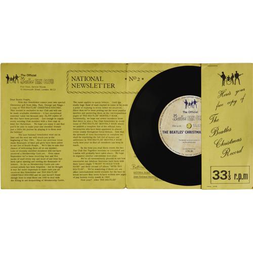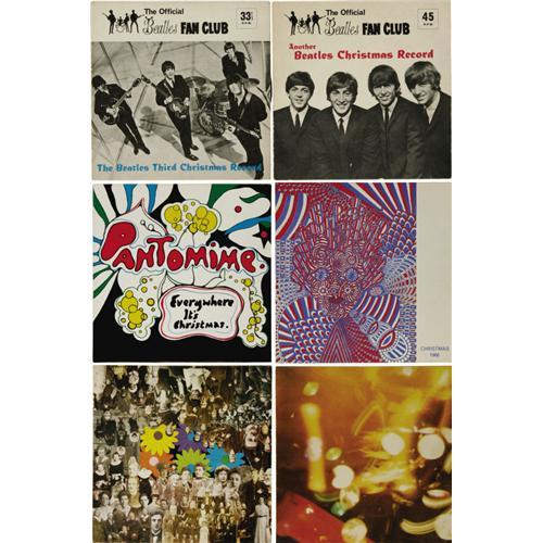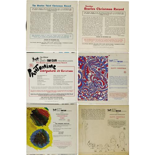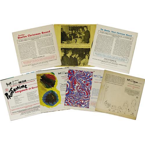 <B>Beatles Complete Set of Xmas Fan Club Flexi-Discs (UK, 1963-69).</B></I> There are seven discs in this UK set, and it's tough to find 'em all. The earliest one from '63 came with a gatefold cover. There is some yellowing of the gatefold cover, but what a fab piece! It's in VG 5/ EX 7 condition. The other six flexi-discs came with picture sleeves and with Fan Club inserts, except for 1968 (no insert). All covers 1964-69 are in NM 8, except 1964 in EX 7. The discs are all in NM 8, except 1968 in EX 7.