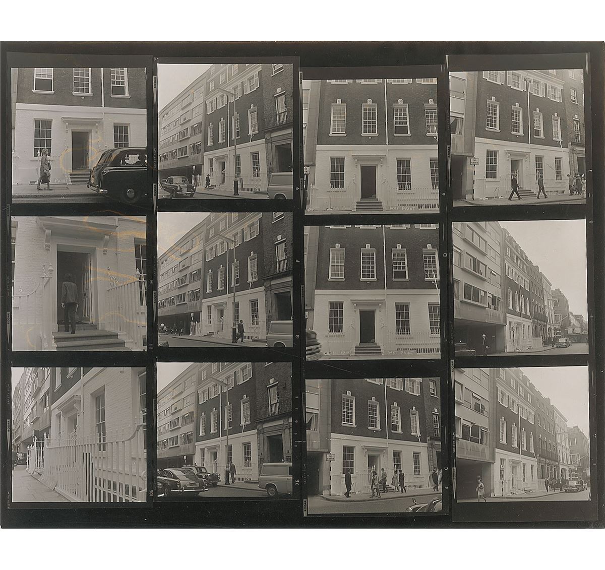 Seldom-seen glossy 10 x 8.25 contact sheet depicting the Beatles’ Apple offices in London’s Savile Row circa 1968. Sheet features twelve different exterior shots of the office’s white brick facade and cast iron gates. Reverse bears a Pictorial Press Ltd. copyright stamp. Trivial wear to edges and some spots of dampstaining, otherwise fine condition. Accompanied by a certificate of authenticity from Tracks.