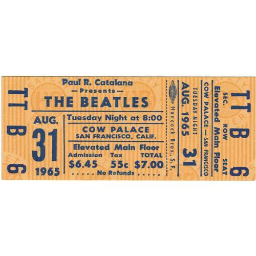 <B>Beatles Cow Palace Concert Ticket.</B></I> An unused ticket to the Beatles' August 31, 1965, evening performance at the Cow Palace in San Francisco, the final show of their 1965 North American Tour. The second of two shows, it was attended by 17,000 fans. In Excellent condition with minimal wear.<BR><BR><b>Shipping:</b> Small Flat (<a target="_blank" href="http://www.heritageauctions.com/common/shipping.php">view shipping information</a>)