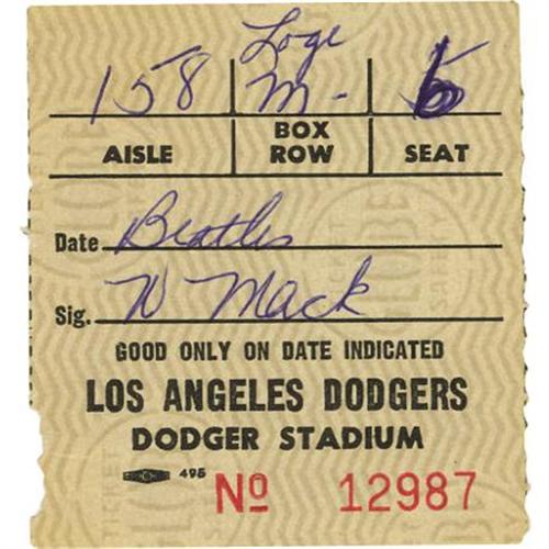 <B>Beatles Dodgers Stadium 1966 Concert Ticket Stub.</B></I> This stub is for the August 28, 1966, show at Dodgers Stadium -- the next to last live performance the group would ever give before ceasing to tour in favor of spending more time in the studio. In Very Fine condition with some mild wear and tearing along the edges.<BR><BR><b>Shipping:</b> Small Flat (<a target="_blank" href="http://www.heritageauctions.com/common/shipping.php">view shipping information</a>)