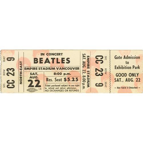 <B>Beatles Empire Stadium Concert Ticket.</B></I> An unused ticket to their August 22, 1964, concert at Empire Stadium in Vancouver. It was the group's first show in Canada, attended by more than 20,000 fans. In Very FIne condition with mild wear and mild to moderate tanning.<BR><BR><b>Shipping:</b> Small Flat (<a target="_blank" href="http://www.heritageauctions.com/common/shipping.php">view shipping information</a>)