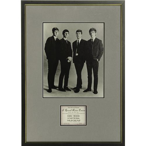 <B>Beatles Ensemble Photo and Ticket Ad.</B></I> Here's an interesting item: an ensemble photo of the Beatles from early in their careers, framed and matted along with a vintage ticket ad detailing a "Grand River Cruise Aboard the Royal Iris" for September 28, 1962. Not only did the cruise include music by the Beatles, swing and big band music by Lee Castle & the Barons and Freddy (the Teddy) Fowell, it also featured "Licenced Bars" and a fish & chip shop. Sounds like it must have been fun!