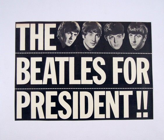 The "invasion" of the Beatles in America in the early 1960's created a sensation never before seen. Besides the complete obsession of the "four boys" by the youth of the country, a very serious campaign shot up by a loyal if somewhat politically confused fan base (during the 1964 elections), to write-in the Beatles for President. Banners, bumper stickers and signs appeared overnight all over the country. This is one of those original 1964 Beatles for President signs. A true rare collectable, and a delightful glimpse into a much more innocent time, just before everything blew up in our face. (Approx 13" x10").