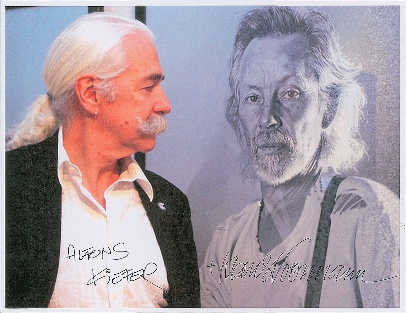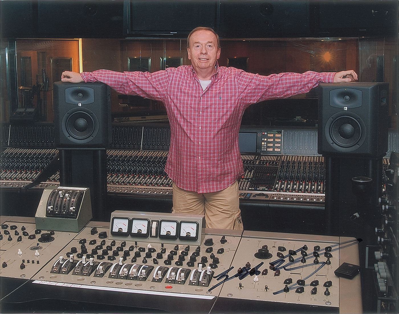 Five signed photos: an 11 x 8.5 laserprint photo of George Martin in the studio with the Beatles, signed and inscribed in black ballpoint, "For George—from George Martin"; a color 11 x 8.5 photo of Alfons Kiefer standing next to an illustrated likeness of fellow collaborator Klaus Voormann, signed by both in black ink, "Alfons Kiefer" and "Klaus Voormann"; a color glossy 8 x 10 close-up photo of Jane Asher, signed and inscribed in black felt tip, "To America, love, Jane Asher, x"; a color glossy 10 x 8 photo of audio engineer Geoff Emerick in his studio, signed in black felt tip, "Geoff Emerick"; and an 8.5 x 11 laserprint photo of Pattie Boyd in an attractive full-length seated pose, signed in black ballpoint, "Pattie Boyd." In overall very fine condition.
