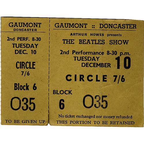 <B>Beatles Gaumont Theatre Concert Ticket.</B></I> An unused ticket from their December 10, 1963 second performance show at the Gaumont in Doncaster. The Beatles were experiencing great popularity on the British charts, but had yet to make inroads into the U. S. market; that would change in about two weeks time, with the band's legendary performance on "The Ed Sullivan Show." The ticket is in Very Fine condition, with a vertical fold crease, very minor edge wear, and is slightly loose around the perforation area.