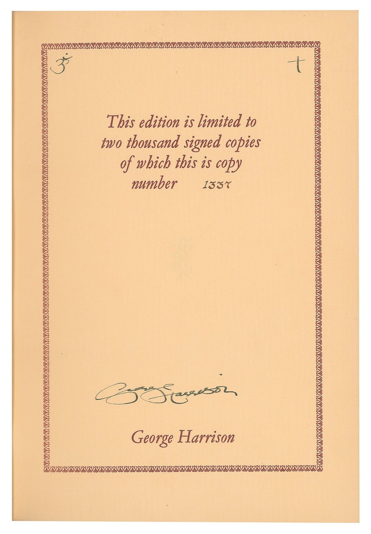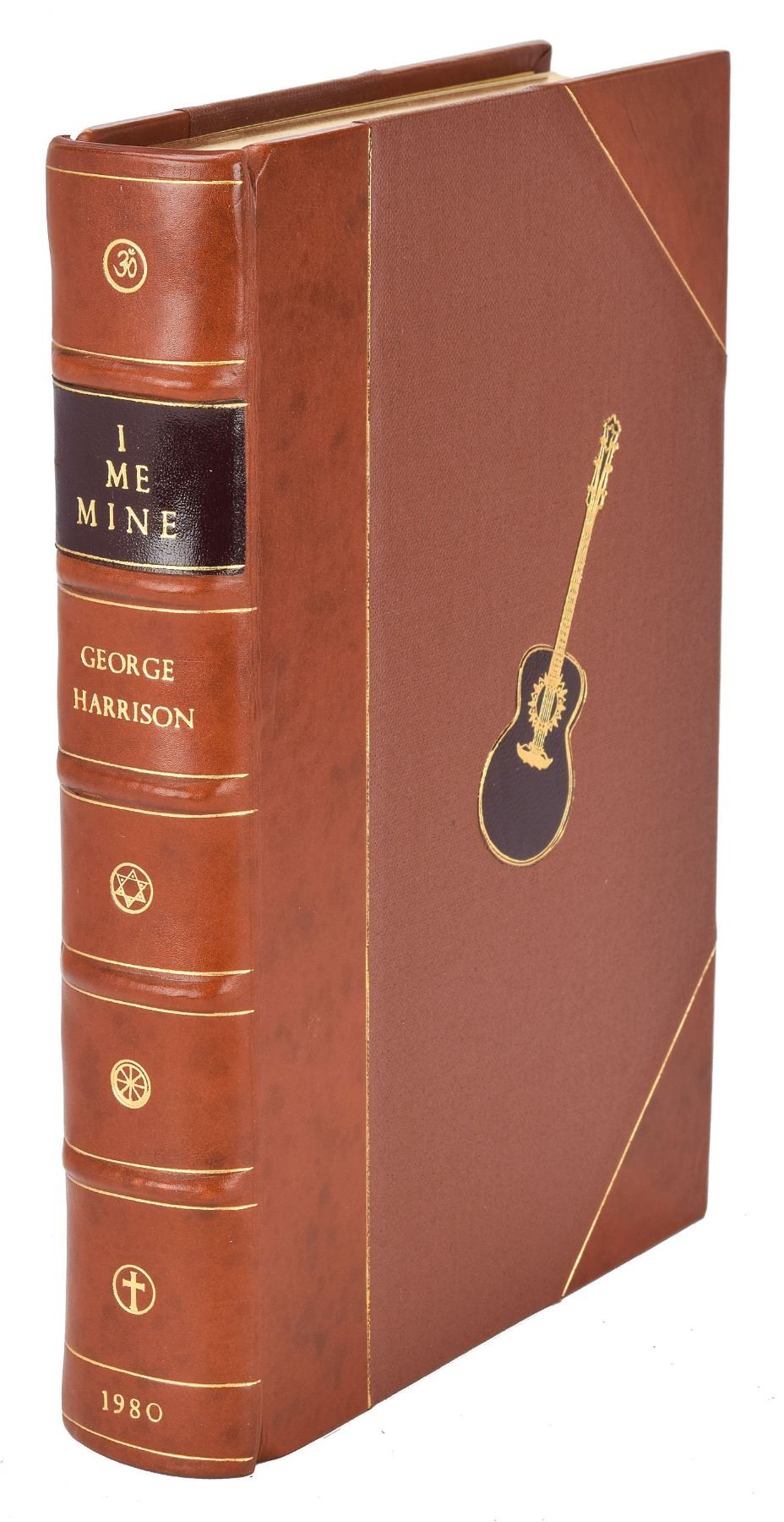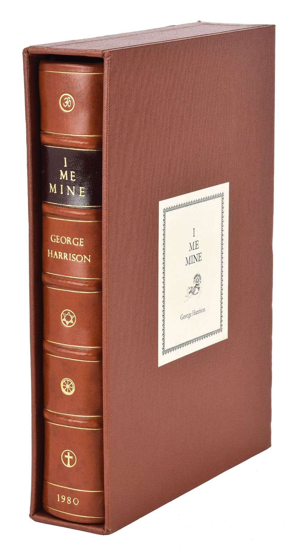 Signed book: I, Me, Mine. Limited edition, numbered 1337/2000. Surrey, England: Genesis Publications, 1980. Hardcover with slipcase, 7.25 x 10.25, 398 pages. Signed on the colophon in fountain pen by Harrison, who adds an Om symbol and cross to upper corners. In very fine condition. A superlative example of this sumptuous leatherbound volume.
