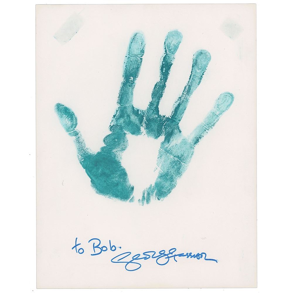 Unique blue paint right-handed hand print of Beatles icon George Harrison on an off-white 8.5 x 11 sheet, signed and inscribed below in blue ink, "To Bob, George Harrison." In fine condition. A spectacular piece evoking his album cover for 'Living in the Material World.'
