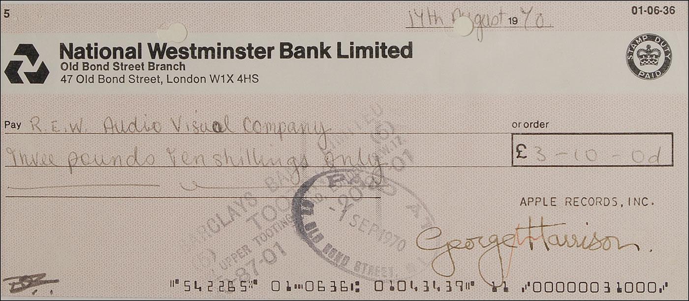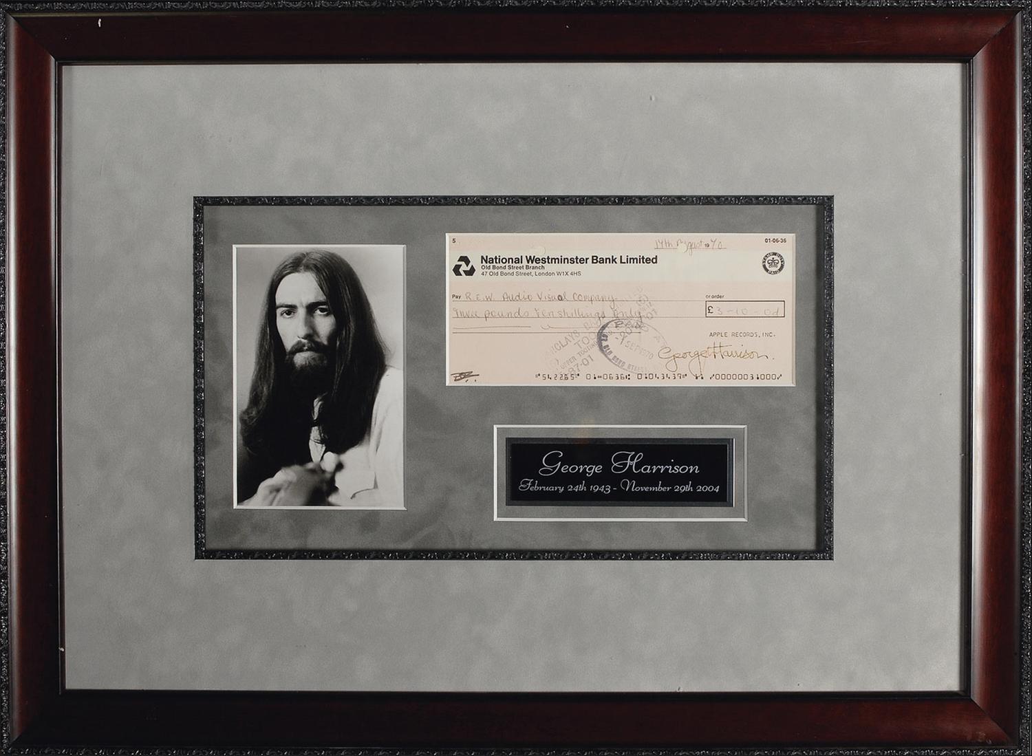 Bank check, 7.5 x 3.5, filled out in another hand and signed by George Harrison, payable to R.E.W. Audio Visual Company for £3.10.0, August 14, 1970. Suede matted and framed with a portrait of Harrison and a small plaque to an overall size of 22.75 x 17. Stamps to body, one over first letter of signature, a small red ink cancellation stroke through signature, and two punch holes to top edge, otherwise fine condition.