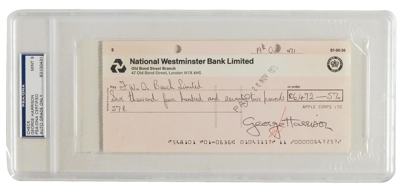 Business check, drawn on the Apple Records, Inc. account, 8 x 3.5, filled out in another hand and signed “George Harrison,” payable to F. W. O. Bauch Limited for £6,472.57, October 19, 1971. Encapsulated in a plastic PSA/DNA authentication holder grading the autograph “MINT 9.” Two punch holes at the top, bank stamps and cancellations, a red ink mark affecting his first name, and show-through from two pieces of white tape on the reverse, otherwise fine condition. Bauch was an engineer and sound recording pioneer whose company sold microphones and high-quality sound equipment.